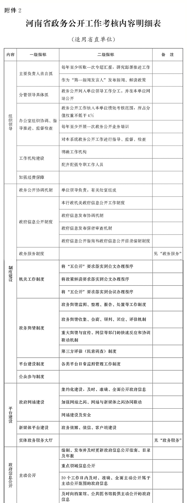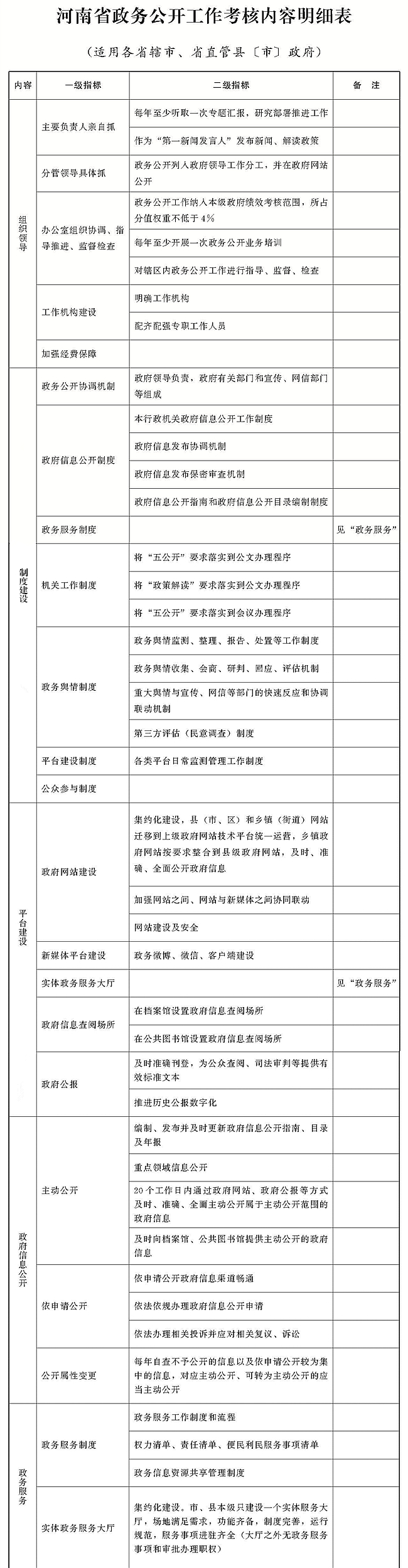第七条 省政务公开工作考核内容按省辖市、省直管县(市)政府和省政府各部门两个类别分别确定(具体考核内容分别见附件2、附件3)。